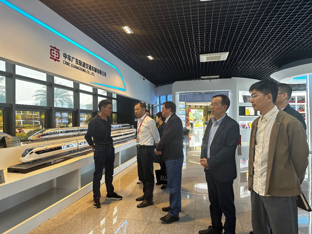 调研会上中车广东人力资源部部长刘宝江介绍了公司的发展历程、技术创新和生产工艺、用人需求等方面的基本情况。李坚对中车广东公司的热情接待表示感谢,简要介绍了公司生源结构、专业分布、员工就业方向。双方就进一步加强校企合作、共同培养轨道交通领域的高素质人才等问题进行了交流和探讨。随后,刘宝江带领大家来到中车广东公司的展厅以及车辆制造、装配车间,参观学习CRH6型系列城际市域列车、CRH2平台高速动车组和城轨地铁车辆车体、总装、调试、转向架造修全过程生产线,了解轨道车辆制造的新技术。