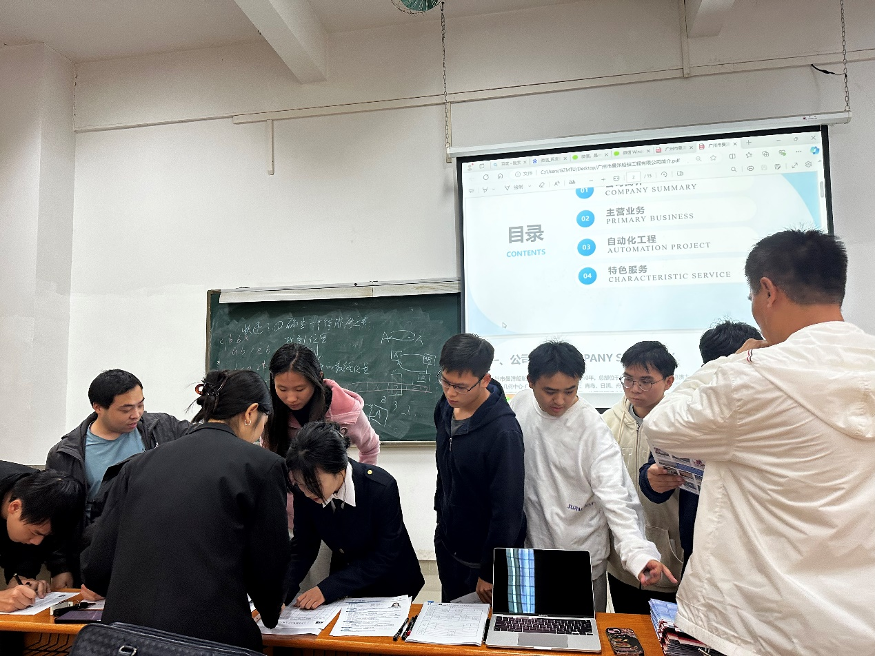 黄金宏结合PPT向在场的同学们展示了公司的企业文化、企业愿景以及行业发展前景,介绍了公司产品、工作环境、研发团队以及应聘需求,鼓励同学们积极投递简历。在互动环节,黄金宏解答了同学们关于福利待遇、岗位适配、职业发展方面的问题。宣讲会结束后,曼洋船舶公司现场组织开展面试工作。