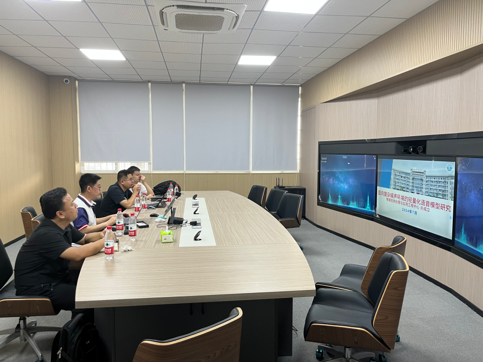 参观过程中,孙成立教授为广电计量公司研究人员详细介绍了实验室的建设愿景、实验设备和研究方向。在随后的会议中,双方就相关研究领域展开了更加深入系统的交流。孙成立教授以“面向复杂噪声环境的轻量化语音模型研究”为主题作报告,汇报了团队在声学信号研究领域的科技创新与技术应用工作。广电计量研究人员也分享了公司目前的重点研究课题。