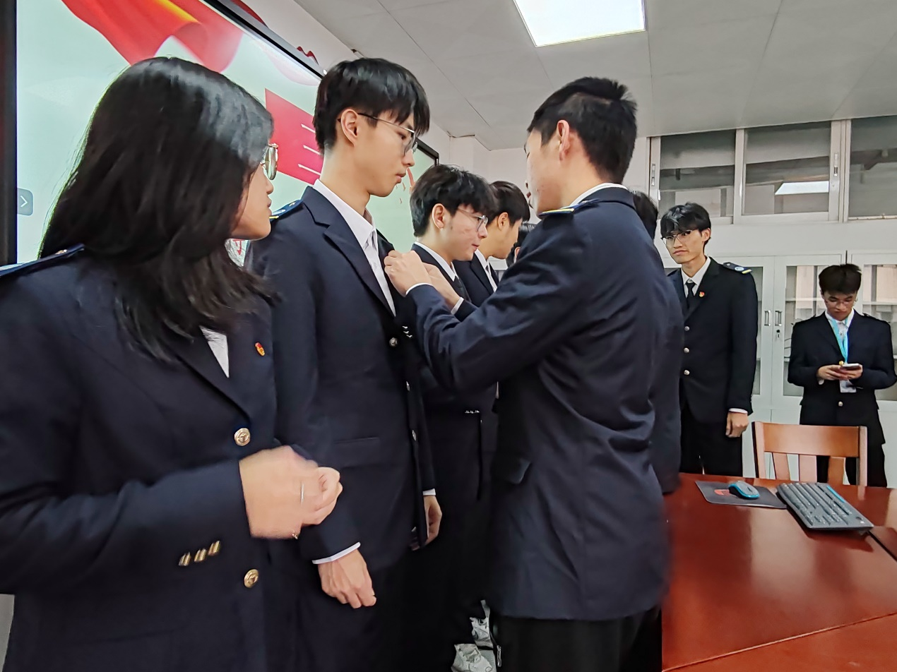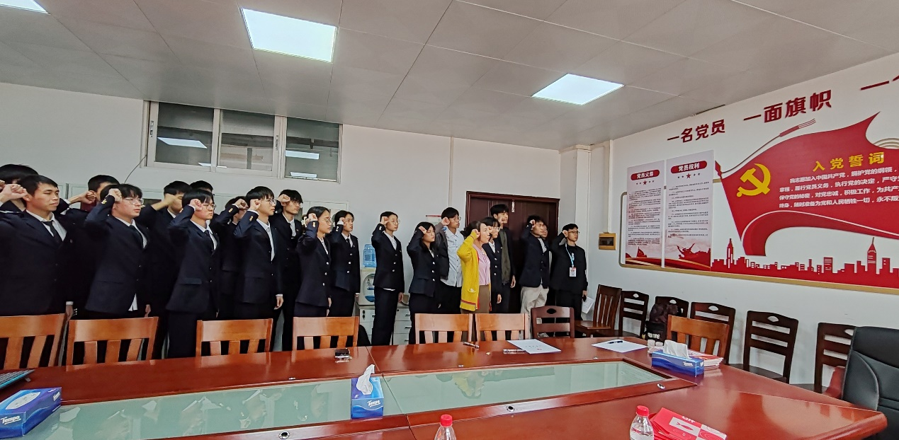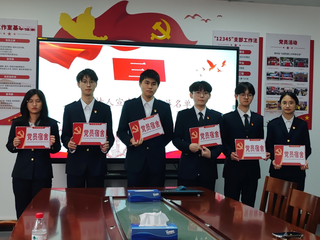 接下来是授予党徽和党员宿舍挂牌仪式。党员宿舍挂牌不仅是对党员身份的郑重宣示,更是对党员日常生活中的言行举止的一种监督和鞭策。而党徽,则是党员身份的象征,它提醒着每一位党员要时刻铭记自己的使命与责任,发挥先锋模范作用,以身作则,带动周围的同学共同进步。这一环节让党员们更加深刻地感受到了身上的责任与担当,也让他们更加坚定了为共产主义奋斗终身的信念。